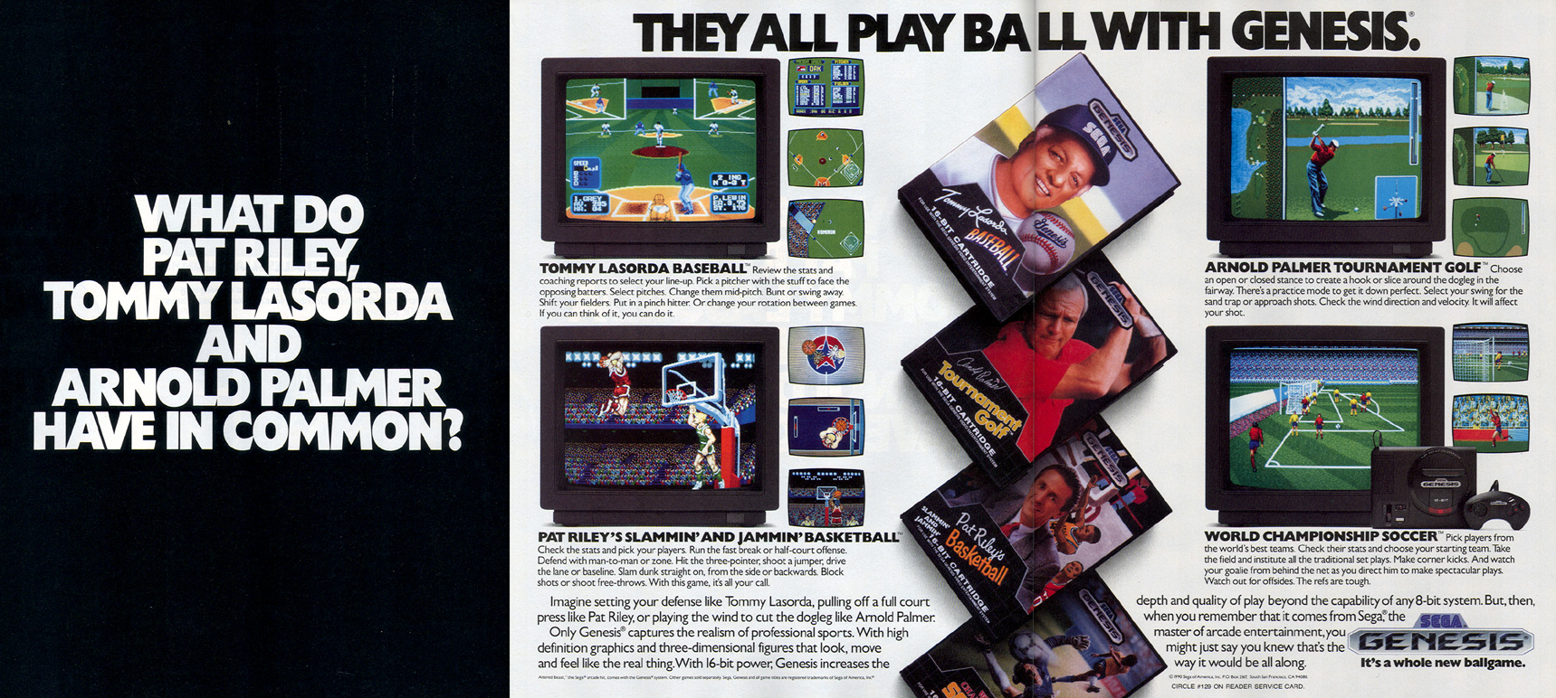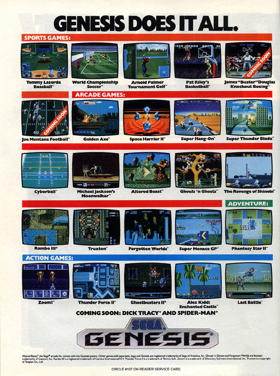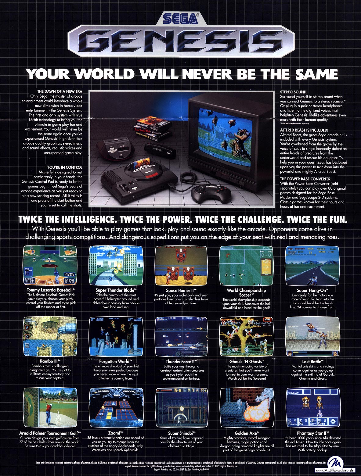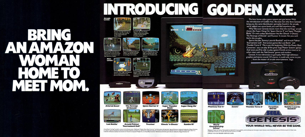 Is this perhaps the first Genesis ad in print?Nerd Quiz: Which of these games is using placeholder box art that was not ultimately used?The first Genesis sports games, a genre that the Genesis would continue to dominate throughout the 16-bit era.I’d totally be okay with bringing Tyris Flare home to meet my mother. If mom didn’t like her, Tyris would stab her in the neck, burn down our house, and we would run off to have adventures and eventually settle on a chicken leg farm… not that I’ve thought about it, though.I hope you like Phantasy Star II, adventure game fans!If you have this pack-in poster, I’ll give you a dollar for it… Maybe even two…