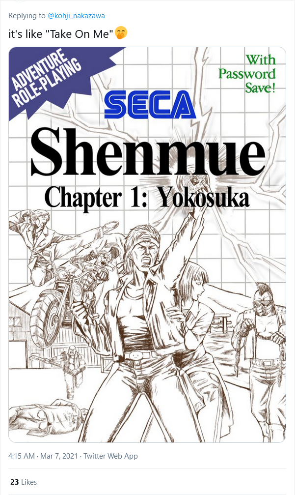 If you’d like to see more of Kohji’s art, Shenmue-related and not (here is a nice Phantasy Star piece as an example), you can find them on Twitter at @kohji_nakazawa.