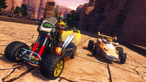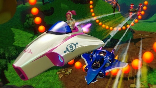 In SASRT, the trick system is tied to the right analog stick. When you jump or are in free fall, tapping either up, down, left or right executes a different trick, which also yields a speed boost when successfully executed. However, failing to complete it properly results in a serious speed penalty along with the announcer calling out “Trick failed!” as though your resulting snail’s pace didn’t clue you in enough.